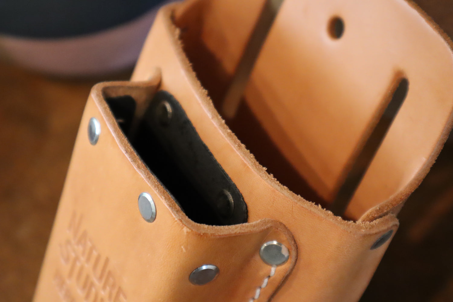 小さなポケットの内側は補強されているので、はさみなどの道具を直接入れることができます。背面にはベルトループが設けられています。
